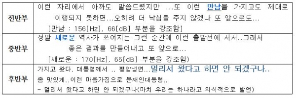 - 전반부에서 종반부로 갈수록 음높이 높임으로써 우호적인 마음을 나타내고자 하였다. 아울러 발화속도, 음성에 실리는 에너지, DoVB 등의 수치를 보았을 시 부드럽고 신중한 지도자의 모습을 의도적으로 보이고자 하였다.(한편으로는 ‘긴장함’도 있음)
