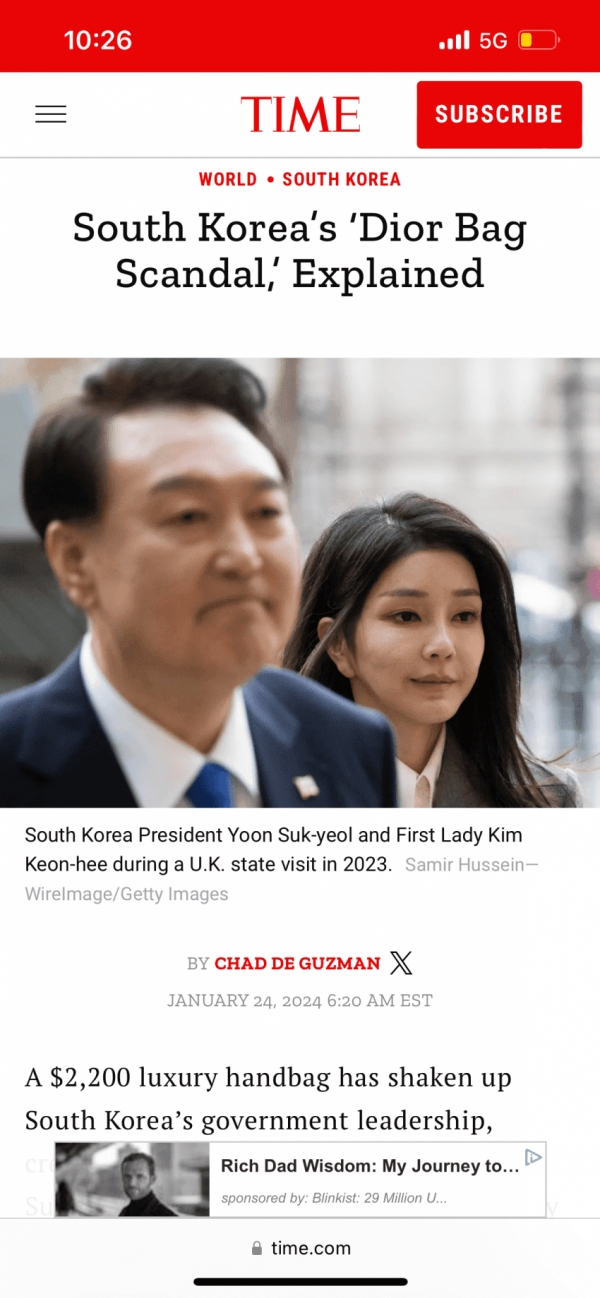 타임지는 디올백 수수 영상이 어떻게 해서 찍혔는지 또 디올백 수수가 법에 저촉되는지 여부, 정부와 여당의 반응 등에 대해서 상세하게 보도했다. 그리고 김건희 여사가 도이치모터스 주가조작 사건에 연루된 의혹과 논문 표절 등에서도 보도했고 김건희 특검법이 국회에서 발의됐으나 윤석열 대통령이 거부권을 행사한 것에 대해서도 보도했다.