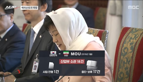 MBC 취재진이 확인한 결과 산업부 소관 18건의 MOU 중 사업이 진행 중인 것은 단 1건에 그쳤고 나머지 17건은 모두 중단, 보류된 상태였음이 밝혀졌다. 즉, 박근혜 씨가 이란 현지에서 52조 대박을 터트렸다는 건 모두 법적 구속력이 없는 MOU로 떡칠된 허상이었던 것이다.