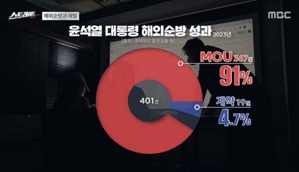 이에 MBC 취재진이 윤석열 대통령이 2023년 한 해 경제사절단을 꾸린 해외 순방 때 맺은 MOU와 계약을 전수 분석했다. 그 결과 윤석열 대통령이 2023년 해외 순방 중 체결한 MOU와 계약은 총 401건으로 나타났다. 그런데 그 중 91%인 367건이 법적 구속력이 없는 MOU였고 실제 계약은 19건으로 4.7%에 불과했다는 사실이 드러났다.