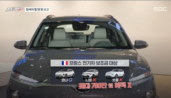 그 덕에 유럽 현지에 공장이 있는 코나만 살아남았고 니로와 쏘울은 보조금 혜택을 받지 못했다. 최대 700만 원의 보조금 혜택이 날아갔을 뿐 아니라 현지에서 한국산 전기자동차의 경쟁력이 떨어지게 됐다. 그에 반해 이미 공장을 현지화한 일본의 경우 도요타와 니산, 마스다의 전기차 6종이 살아남았다.