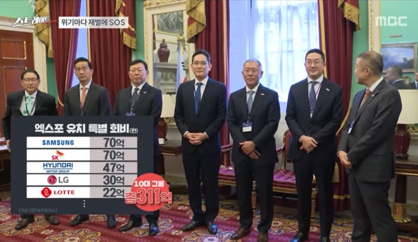 또 MBC 취재에 따르면 2030 부산엑스포 유치전 당시 대한상공회의소가 엑스포 유치 특별 회비를 재벌들로부터 걷었는데 삼성, SK, 현대, LG, 롯데 등 소위 10대 그룹으로부터 총 311억 원의 특별회비를 걷은 것으로 밝혀졌다. 그럼에도 불구하고 정작 프레젠테이션부터 엉망진창이었고 결국 부산엑스포 유치는 실패했다.