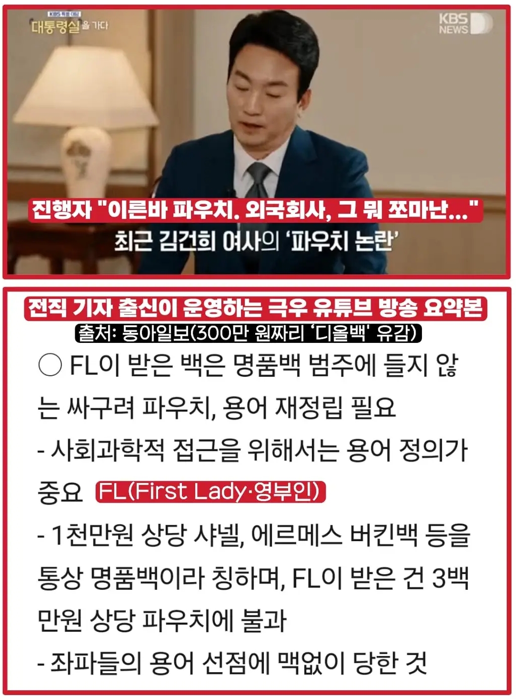그런데 박장범 앵커 역시 “최근 논란이 되고 있는 이른바 '파우치', '외국 회사의 조그만 백'을 어떤 방문자가 김건희 여사를 만나서 놓고 가는 영상이 공개됐다”고 해 그 수구 유튜브 채널의 주장과 거의 일맥상통한다고 볼 수 있다.