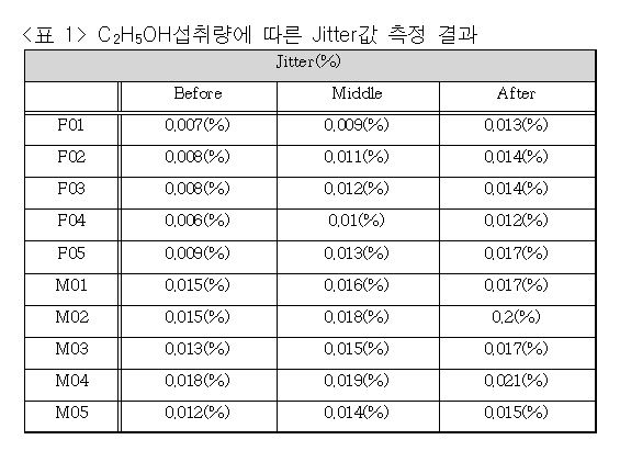 <표 1>에서 성대의 진동 변화에는 큰 변화가 보이지 않는다. Jitter값의 변화와 체내 알코올 함량의 관계는 관련이 없어 보이지만 체내 알코올 함량이 증가할수록 Jitter값이 높아지는 것을 알 수 있다.
