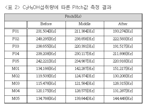 다시 말해 사람의 음주 전 성대 진동의 변화가 음주 후 다른 결과값으로 변화되는데 특히, 남성과 여성집단이 동일하게 C2H5OH 섭취 이후에 Jitter값이 증가하여 C2H5OH 섭취로 인해 ‘발음의 부정확해 지는 것’으로 분석되었으며 C2H5OH 섭취량에 따라 여성은 Pitch와 Shimmer값이 낮아지고 남성은 오히려 Pitch와 Shimmer가 높아지는 것으로 분석되었다.