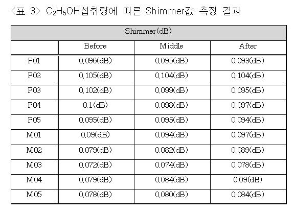 마지막으로 <표 3>에서 Shimmer값의 경우는 여성이 섭취량 증가에 따라 값이 낮아지는 반면 남성은 오히려 Shimmer값이 높아지는 것으로 나타났다. 결과적으로 여성의 경우 알코올 섭취량이 많으면 Pitch와 Shimmer가 낮아지고 남성의 경우 알코올 섭취량이 많으면 Pitch와 Shimmer가 높아지는 것을 알 수 있다.