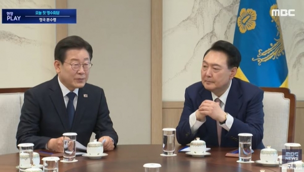 [굿모닝충청 설인호 기자] 윤석열 대통령이 취임 이후 2년 만에 처음으로 야당 대표와 마주앉았다. 윤 대통령과 민주당 이재명 대표는 29일 오후 용산 대통령실에서 차담회를 진행했다.