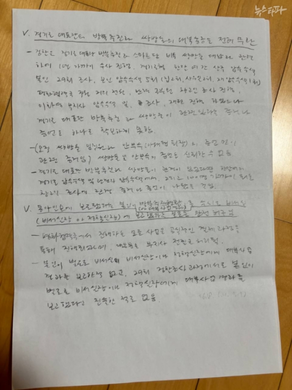 여기서 '좋은 일'이란 신 전 국장에 대한 석방을 뜻한다. 그는 또 이 전 부지사를 검찰에서 세 차례 만난 날짜를 모두 적어놓은 쪽지도 갖고 있다고 말하면서 뉴스타파에 자신이 구치소에서 적은 문건 3장을 제시했다. 제목은 '방북 추진 관련 신명섭의 입장'이다.