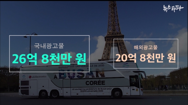 부산시는 최종 투표를 코앞에 둔 시점에서도 해외 언론보다 국내 언론에 홍보를 치중하는 전략을 고수했다. 개최지 투표를 직전에 둔 지난해 11월 한 달간, 부산시가 국내 언론에 지출한 광고비는 10억 원이 넘는다. 작년 11월, 한 달간 부산시는 개최지 선정 투표일로부터 D-30, D-7, D-DAY 등 세 단계로 나눠 국내 신문 광고비로 5억 8,800만 원, 국내 방송 광고비로 3억 2,000만 원 등 2023년 11월 한 달간 국내 신문과 방송을 모두 합해 11억 8,800만 원의 광고비를 썼다.