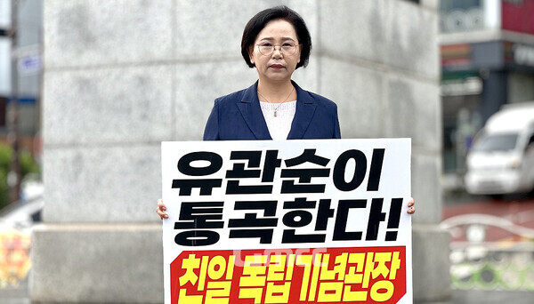 재선 충남도의원 출신인 김 상임대표는 “유관순이 통곡한다! 친일 독립기념관장 즉각 해임하라!”는 문구가 담긴 피켓을 들고 결연한 의지를 드러냈다.