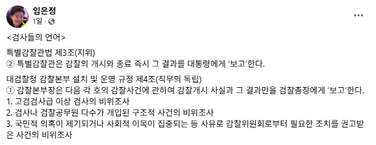 임은정 대전지검 중요경제범죄조사단 부장검사는 27일 자신의 페이스북에 ‘검사들의 언어’라는 제목의 글을 올린 뒤 ▲특별감찰관법 제3조(지위) ② 특별감찰관은 감찰의 개시와 종료 즉시 그 결과를 대통령에게 ‘보고’ ▲대검찰청 감찰본부 설치 및 운영 규정 제4조(직무의 독립) ① 감찰본부장은 다음 각 호의 감찰사건에 관해 감찰개시 사실과 그 결과만을 검찰총장에게 ‘보고’ 등의 규정을 게재했다.