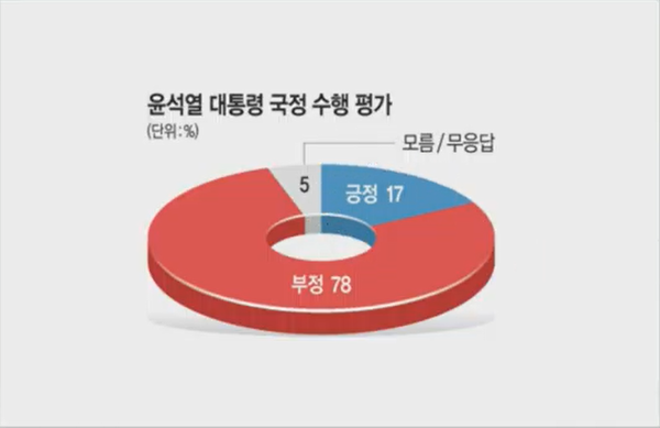 문화일보 창간 33주년을 맞아 실시한 엠브레인퍼블릭 여론조사에서 윤석열 대통령의 직무수행평가는 긍정 17%, 부정 78%를 기록했다. 그 밖에 ‘모름·무응답’은 5%를 기록했다. 심지어 보수층에서조차 35% : 59%를 기록해 부정평가가 60%에 육박해 역시 윤 대통령에게 등을 돌린 것이 확인됐다.