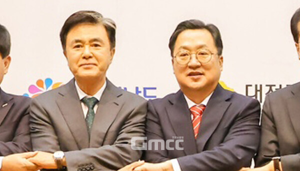 김 지사는 “저는 좀 약하고 이 시장은 좀 더 강하시다. (중앙정치에서) 영·호남들끼리 합쳐서 큰 사업을 하는 경우는 있는데, 우리(충청권)가 어떻게 보면 좀 피해를 볼 때도 있고 불리한 부분들이 있다”며 “충청권이 제 몫을 찾고 또 우리 목소리를 낼 수 있는 그런 정치지형을 만들까하는 그런 고민적인 측면에서는 동의한다”고 의견을 냈다.