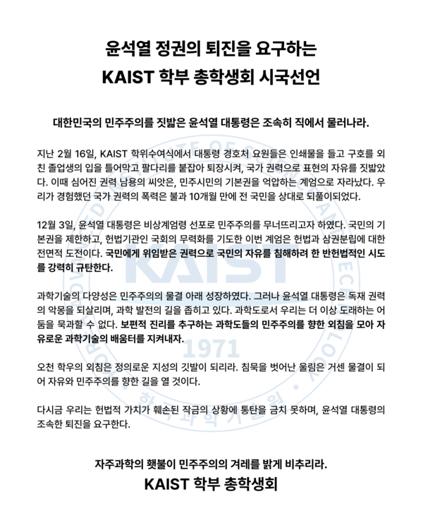 KAIST(한국과학기술원, 총장 이광형) 학부 총학생회(회장 윤서진)는 7일 윤석열 정권 퇴진을 요구하는 시국선언문을 발표했다.