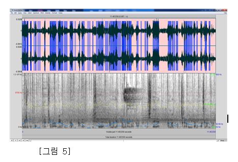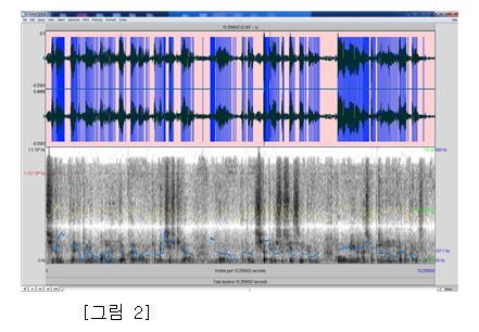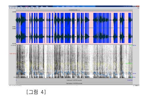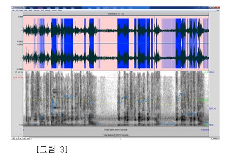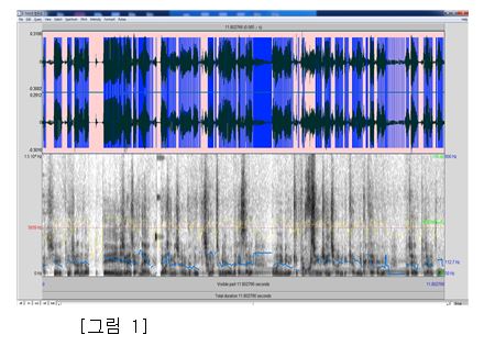 아울러 각 각 상황에서의 실험에 대한 수치 결과를 <표 1>에 나타내었다. <표 1>에서 알 수 있듯이 격앙된 급한 상황이 아닐 시는 평소 음성이나 대통령 역을 맡은 음성이나 음높이가 90[Hz]대에서 120[Hz]대로 상당히 낮은 음높이를 형성하고 있다. 아울러 음성에 실리는 에너지도 60[dB]대의 부드러운 에너지대를 형성하고 있다.