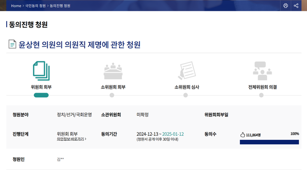 그 밖에 윤석열 대통령의 계엄령 선포를 '통치행위'라고 미화했던 윤상현 의원 제명 청원이 올라와 현재 10만을 돌파한 것으로 확인됐다. 29일 오후 2시 20분 기준 해당 청원의 동의인 숫자는 11만 1864명을 기록 중인데 국민동의 청원은 동의기간으로 제시된 30일 안에 5만명 이상의 동의를 얻은 안건에 대해 국회 소관 상임위원회가 심의하게 된다.