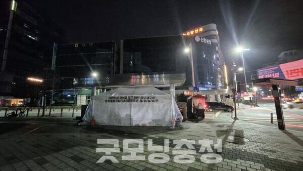 14일 새벽 대전 서구 둔산동 은하수네거리 대덕지하보도 입구 한편. 철야 농성장을 지키고 있는 민주평등사회를위한교수연구자협의회(민교협) 대전세종충남지회 전·현직 교수들을 <굿모닝충청>이 만났다.