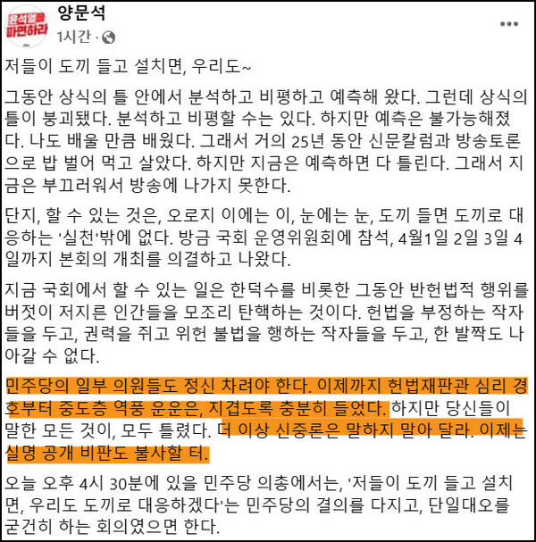 양 의원은 31일 자신의 SNS에 "지금은 예측하면 다 틀린다"며 "단지, 할 수 있는 것은, 오로지 이에는 이, 눈에는 눈, 도끼 들면 도끼로 대응하는 '실천'밖에 없다"고 썼다.