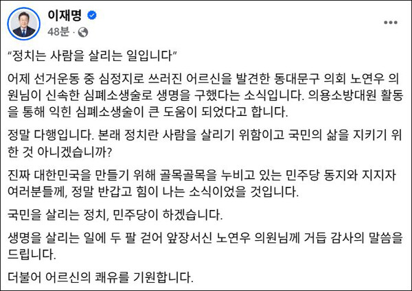 이어 "민주당 동지와 지지자 여러분들께, 정말 반갑고 힘이 나는 소식"이라며 "생명을 살리는 일에 두 팔 걷어 앞장서신 노연우 의원님께 거듭 감사의 말씀을 드린다. 더불어 어르신의 쾌유를 기원한다"고 했다.