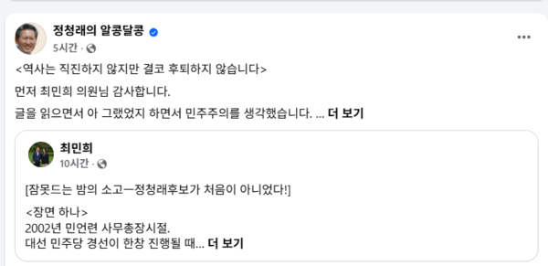 앞서 최민희 의원이 페이스북에 올린 장문의 글에서 정청래 의원을 “당의 기존 엘리트질서에 속하지 않은 자체발광형 정치인”으로 평가한 것에 대해 정 의원이 직접 연대의 뜻을 밝힌 것이다.