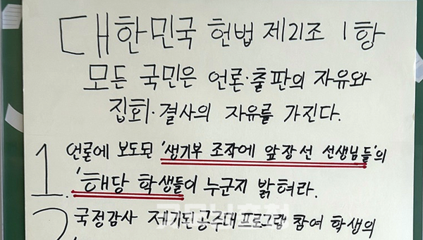 이로 인해 차별을 당했다고 느끼는 학생들이 적지 않은 가운데, 급기야 지난달 31일 오전에는 교내에 대자보가 붙어 해당 교사들의 반성과 사과를 촉구하는 상황까지 발생했다.