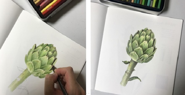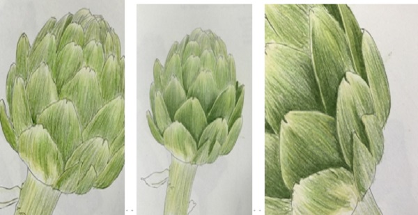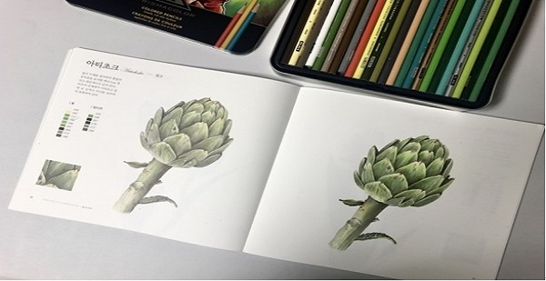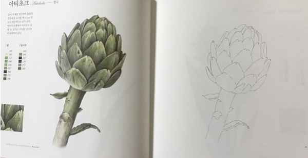 다음 날 그리기로 선택한 것은 바로 '아티초크'다. 색깔이 다 초록색이라 그리기가 좀 쉬워보였다. 역시 왼쪽에 보이는 색을 참조로 색연필을 골랐다. 연한 노란색 1개랑, 초록색 4가지, 갈색 종류 2개, 검은색 이렇게 선택했다. |