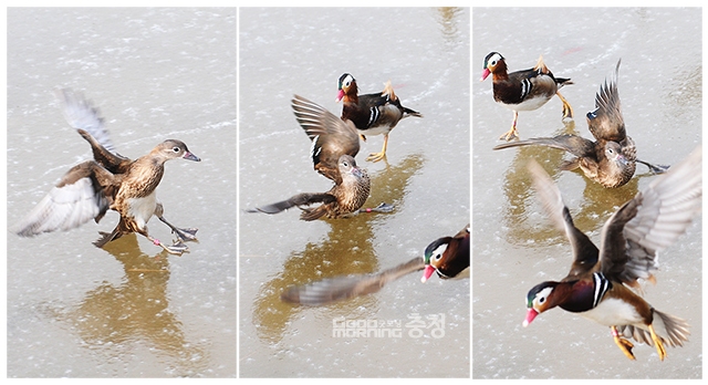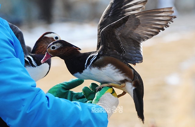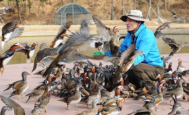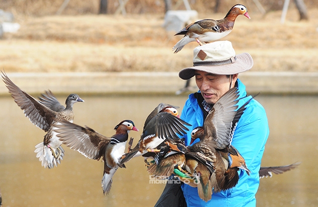 그가 새장을 열며 “나가자 얘들아” 한마디에 원앙과 비둘기들이 하늘을 날아오른다.