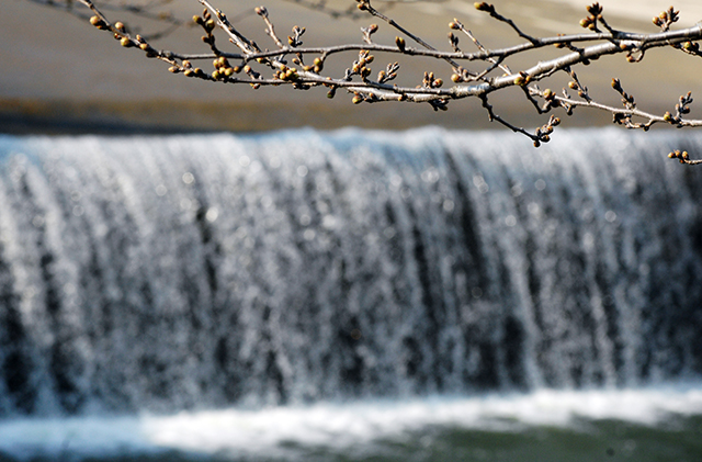 꽃망울이 맺힌 벚꽃 나무 아래로 얼었던 물이 햇살에 반짝이며 봄을 타고 있다.