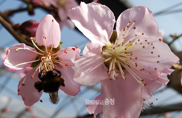 하우스 안에서 자란 진분홍 복숭아꽃에는 벌써 벌들이 날아들고 있다.