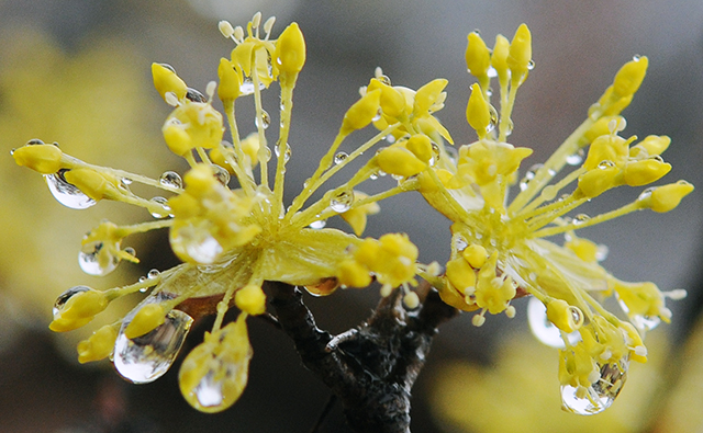 봄비를 머금으며 피어난 산수유 꽃은 벌들을 유혹할 것이다.