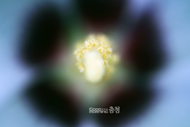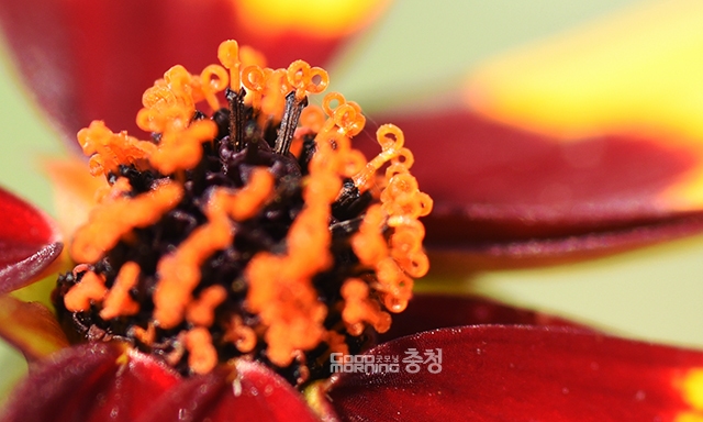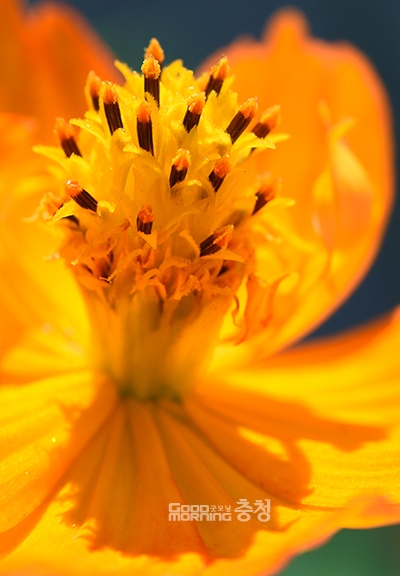 살살이 꽃이라 불리는 코스모스 속살은 사랑을 상징하는 하트 모양 꽃술이 빛을 받아 반짝거리고 있다.