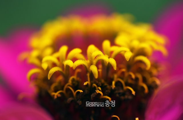 백일홍 노란 꽃술은 옹기종기 모여 수다를 떨고 있다.