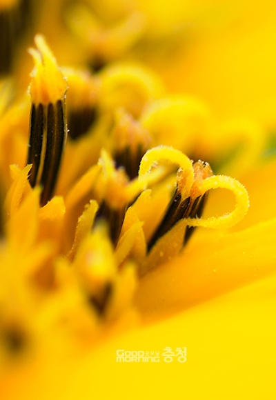 해바라기는 마치 꽃 한 송이처럼 보이지만 실제로는 이처럼 수많은 관꽃과 혀꽃이 모여 이루어진 수백 송이 꽃인 셈이다.