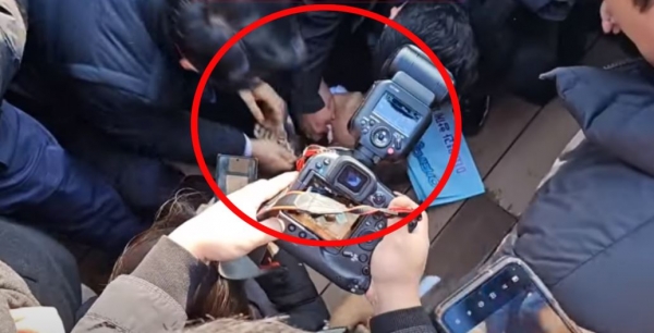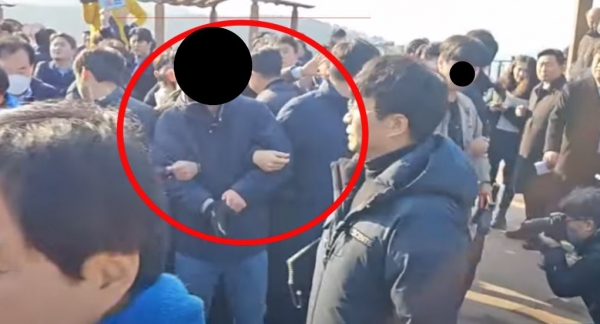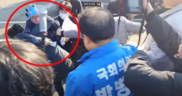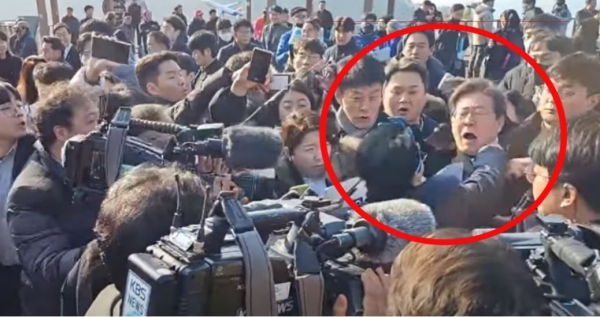 순간 강한 충격으로 ‘퍽’ 소리가 났고, 이 대표는 그 자리에서 넘어졌다. 괴한은 재차 공격을 시도했고, 당직자를 포함해 주변 사람들이 강하게 저지했다.