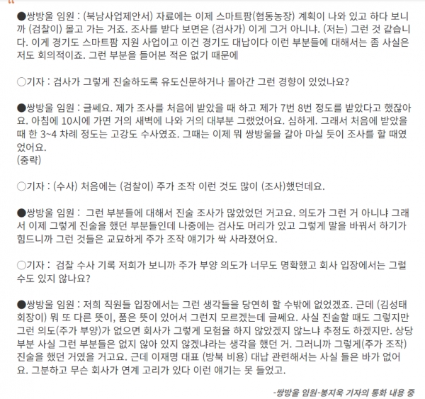 그럼에도 검찰은 이 '협동농장'을 경기도 '스마트팜'과 동일한 것으로 특정했다. 이런 검찰 수사에 대해 임원 A씨는 "검사가 계속 윽박지르면서 조사를 하다보니, 진술도 거기에 맞춰서 가게 됐다"고 폭로했다.