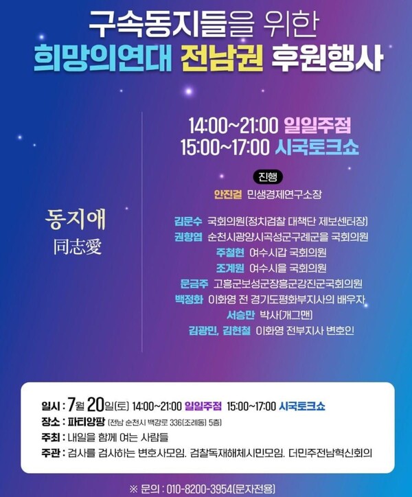 한편 이번 출간을 기념하고 후원의 뜻이 모일 수 있도록 ‘구속동지들을 위한 희망의연대 전남권 후원행사’가 20일 오후 2시부터 순천 파티앙팡에서 열린다. 일일주점 형태의 행사이며 당일 오후 3시부터 인진걸 민생연구소장이 진행하는 시국토크쇼가 개최된다.